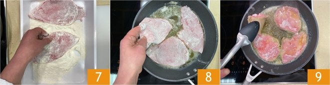 Meanwhile, flour the meat slices one by one, removing excess flour by gently shaking them 7. When the butter is completely melted, slightly raise the heat and place the slices in the pan 8. Let them brown for 1-2 minutes, then turn them over 9.