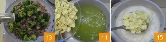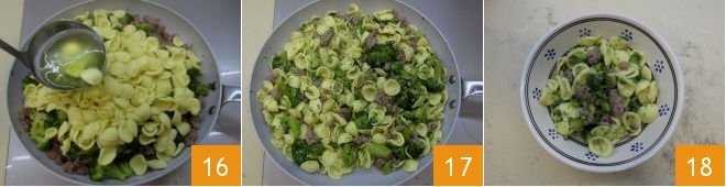 and add a pinch of black pepper 13. Bring the water you used to cook the broccoli back to a boil, pour in the pasta, and leave to cook 14. Once the pasta is cooked, use a slotted spoon 15 to drain it and transfer directly to the broccoli and sausage sauce.