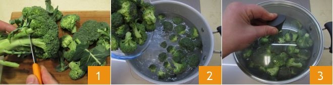 To prepare the orecchiette with broccoli and sausage, start by bringing a pot of salted water to a boil. Cut the broccoli into florets 1 and slice them in half, or even quarters if they’re too large. Place them in the boiling water 2 and put the lid on the pot 3. Cook the vegetables for 6-7 minutes, and in the meantime, continue with the rest.