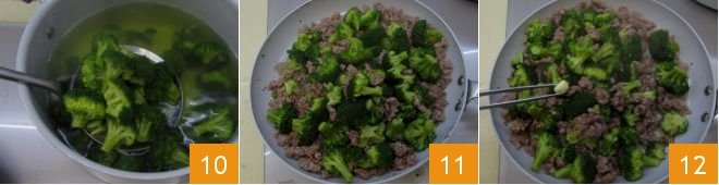 Using a slotted spoon, and without discarding the cooking water, remove the cooked broccoli 10 from the pot of water and add it to the meat a little at a time 11. Leave everything to cook for 3-4 minutes, then use kitchen tongs 12 to remove the garlic,