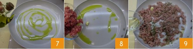 Drizzle some olive oil into a large frying pan 7 and fry the garlic clove, then add the sausage 8. After a few seconds, add the chopped herbs and deglaze the pan with the white wine 9.