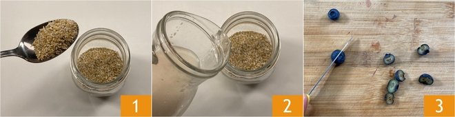 To prepare the overnight porridge, pour the oat bran into a glass jar 1, then add the rice milk 2. Wash and halve the blueberries 3.