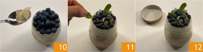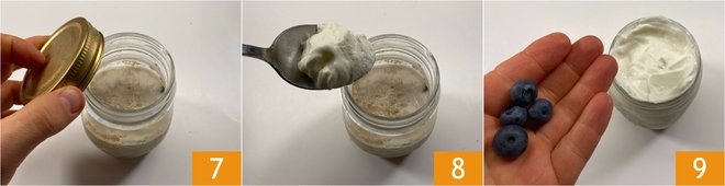 The next morning, remove the lid 7, then top with the Greek yogurt 8 and the whole blueberries 9.