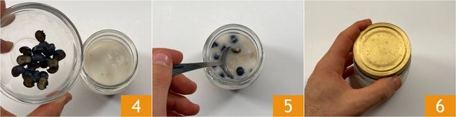 Add the blueberries 4, stir 5, and cover with the lid 6. Let sit in the refrigerator overnight.