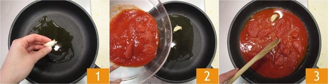 To make the paccheri with 3 tomatoes, start by sautéing a clove of garlic in its skin in a pan with a drizzle of oil 1, then add the San Marzano tomatoes 2 and simmer for a few minutes 3.