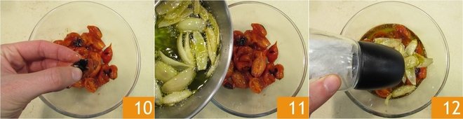 Transfer the grilled cherry tomatoes to a bowl and remove the most burnt parts that would give the sauce a bitter aftertaste 10. Add the oil with the shallot 11, salt 12, and pepper.