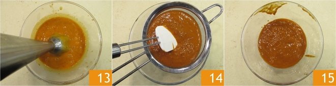 Mix and blend everything with an immersion blender 13, then strain the mixture through a sieve 14 to obtain a smooth and homogeneous consistency 15.