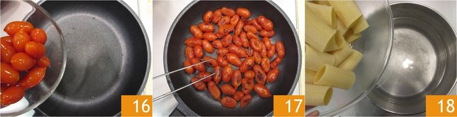 Finally, pour the date tomatoes, which you previously immersed in a bowl with water, into a hot pan without oil 16. Cook over high heat for a few minutes, piercing them with a fork to soften them slightly 17. Bring a pot of salted water to a boil where you will cook the paccheri 18.