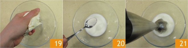 Meanwhile, halve a buffalo mozzarella (you should take 1.4 oz) and squeeze it into a bowl to obtain the milk 19. Add the rice starch 20 and blend with an immersion blender 21.