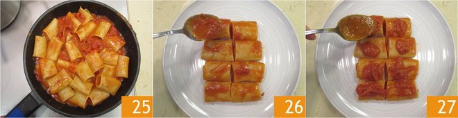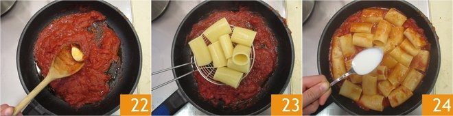At this point, remove the garlic from the San Marzano sauce 22 and adjust the salt. Add the al dente drained paccheri 23 and moisten with almost all the mozzarella milk 24.