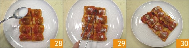 Finish with the remaining mozzarella milk 28 and the date tomatoes 29. Your paccheri with 3 tomatoes are ready to be served 30!