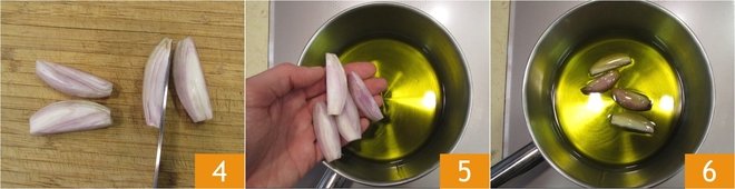 Move on to the shallot-infused oil: clean and cut the shallot into 4 parts 4, then place it in a small saucepan with the extra virgin olive oil 5. Bring to a boil and let it fry briefly 6, then remove the saucepan from the heat and let it cool.