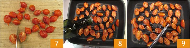 Meanwhile, halve the Piennolo cherry tomatoes 7 and place them on a very hot grill with the skin side down. Season with a drizzle of oil 8 and grill until the skin is blackened 9.