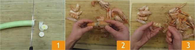 To prepare paccheri with shrimp and scampi cream, wash and slice the leek 1. Proceed with cleaning the crustaceans. Remove the heads 2, discard the shells (they will be used for the broth), and remove the intestines (the black thread along the back of the shrimp and scampi) 3. Set the meat aside.