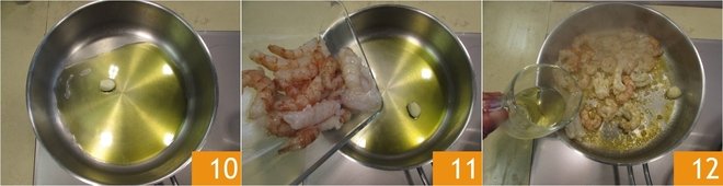 In a pan, heat a drizzle of oil with the garlic clove 10, add shrimp and scampi 11, and sauté for 2-3 minutes over high heat, then deglaze with white wine 12.