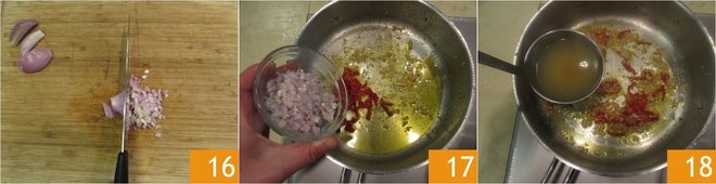 Clean and chop the shallot 16. In the pan where you cooked the crustaceans, add a drizzle of oil, the chili pepper, and the shallot 17. Stew, adding a ladle of broth 18.