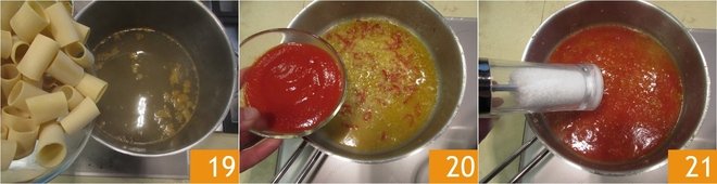 Bring the broth to a boil and cook the paccheri until very al dente 19, adjusting according to the package instructions: in our case, the total cooking time is 18 minutes, so we boiled them for 10 minutes to continue cooking in the pan with the sauce. While the paccheri are cooking, add the tomato sauce to the pan with the sauté 20. Add salt 21.