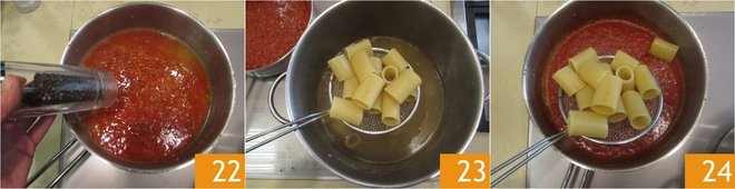 Season with pepper to taste 22. Drain the paccheri 23 directly into the pan with the sauce 24. Continue cooking the paccheri.