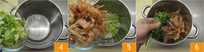 In a pot, add the leek 4, crustacean heads and shells 5, and a few sprigs of parsley 6.