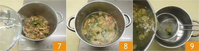 Cover with water 7 and boil for at least 90 minutes. When done 8, strain the broth 9 and pour it into a tall pot that will be used for cooking the pasta.