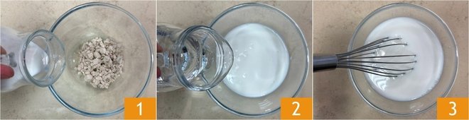 To prepare the pain au chocolat, first pour the milk 1 and water into a bowl with the crumbled yeast 2, then mix to dissolve it completely 3.