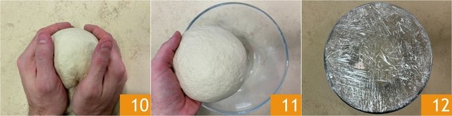 Move to the work surface and form a smooth dough piece 10, then place it in the bowl 11 and cover with several layers of plastic wrap 12. Let it rise in the refrigerator overnight.
