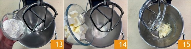 In the meantime, prepare the butter for the puff pastry: in the stand mixer fitted with a paddle, pour the flour 13 and softened butter 14, then mix until you get a homogeneous mixture 15; be careful not to overwork it.