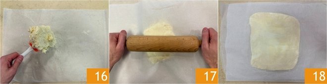 Transfer the mixture onto a sheet of parchment paper 16, cover with another sheet of parchment paper, and roll it out with a rolling pin 17 to form a square of about 8x8 inches, with a thickness of about 0.4 inches 18. Place this in the refrigerator to rest as well.