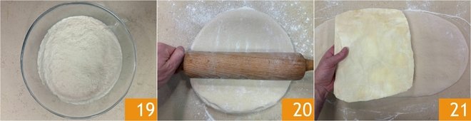 The next morning, take the risen dough 19 and roll it out on a lightly floured surface to obtain a rectangular shape twice the length of the square 20. Place the square of butter in the center of the rectangle 21.