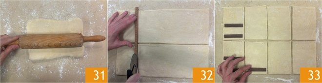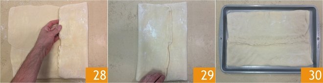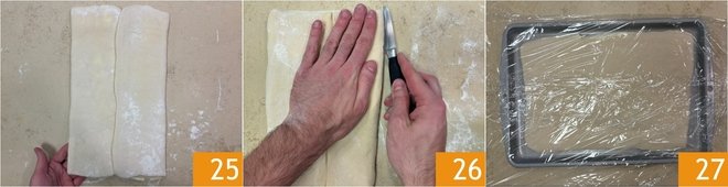 At this point, proceed with a 3-fold by folding the side flaps towards the center and aligning them 25. With a sharp knife, score the long sides of the rectangle obtained 26. Transfer the pastry to a tray, cover with plastic wrap 27, and let it chill in the refrigerator for 30 minutes.