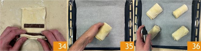 Roll up the pastry rectangles to enclose the chocolate sticks inside 34, then place the rolls on a baking tray lined with parchment paper, well spaced 35. Spray the surface with a little water 36 and let them rise at room temperature for about 3 hours. You can cover them with a baking sheet or place them in the turned-off oven with the light on, taking care to spray them with water occasionally if the surface starts to dry out.