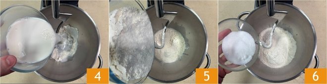 Transfer the mixture into the bowl of a stand mixer fitted with a hook 4, then add the flour 5 and sugar 6.