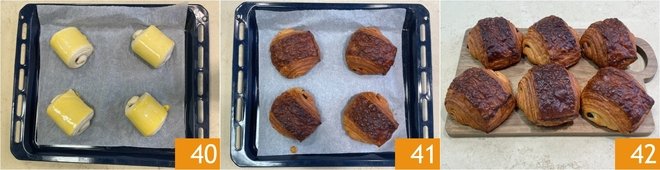 Bake in a preheated convection oven at 356°F for about 6 minutes, then insert a ball of foil into the door to keep it slightly open and continue baking for another 12 minutes 40. When they are beautifully golden and fragrant, remove from the oven and let them cool slightly 41. Your pain au chocolat is ready to be enjoyed 42!
