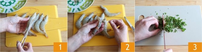 To prepare pan-seared prawns, start by cleaning the prawns: cut the legs with scissors 1, then gently remove the shell, leaving the tail and head attached. Use a toothpick to remove the black vein, the intestine 2. Wash and chop a bunch of parsley with a knife and set aside 3.