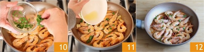Season with a pinch of salt, the chopped parsley 10, and the lemon juice 11, cook for another couple of minutes. Serve the pan-seared prawns hot 12.