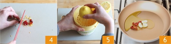 Slice the chili pepper into rings 4, you can decide whether to keep the seeds or not. Squeeze the juice of one lemon 5. Now heat the oil in a pan, then sauté the peeled garlic and chili pepper 6.