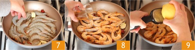 After a few moments, place the prawns in the pan 7 and cook them for 2 minutes on each side over high heat. Deglaze with the brandy 8, slightly tilt the pan and let it flambé until the flame extinguishes on its own. Add the grated lemon zest 9.