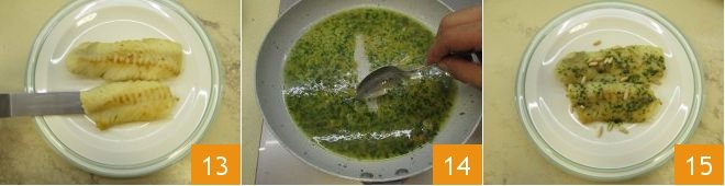At this point, transfer the fillets to a serving plate 13; then with a spoon, take the sauce from the pan 14 and place it on the fillets. Finish with the toasted pine nuts and your pan-fried cod fillet is ready to be served while still hot 15.