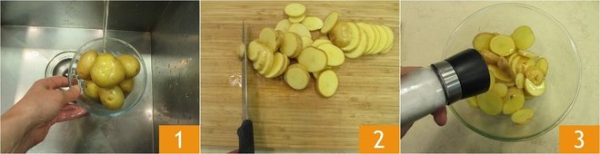 To prepare pan-fried sea bream fillets and potatoes, start by thoroughly washing the potatoes 1; cut them into roughly 0.2 inch slices, without peeling 2. Place them in a bowl and season with salt 3, black pepper and oil.