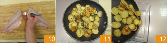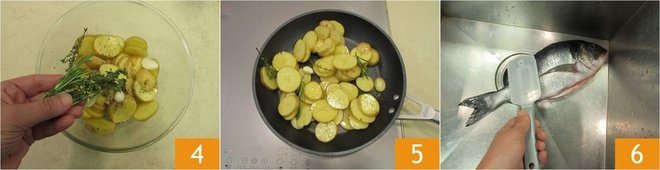 Add the peeled garlic clove too, along with the thyme and rosemary sprigs 4. Place the potatoes in a large pan and cook on a medium to low flame for around 30 minutes. Try not to turn them over to avoid breaking them up: sauté them only. Clean the sea bream in the meantime. Gut and descale the fish using the special tool 6, or a knife, using the blunt side.