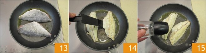 Place a drizzle of oil in the same pan you used to cook the potatoes and place the sea bream fillets in the middle 13. Cook for around 10 minutes on a low flame and gently turn the fillets over half way into the cooking time 14. Add salt and pepper to taste 15.