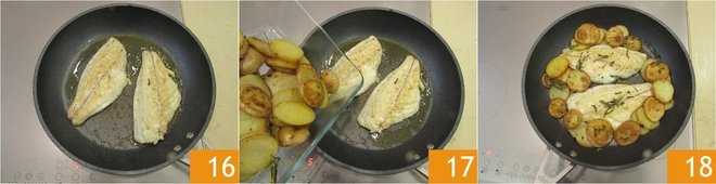 Add the potatoes 16 when the fillets are done 17. Heat them up 18 and serve your pan-fried sea bream and potatoes!