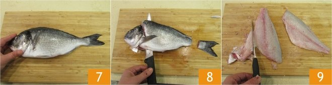 Place the sea bream on a cutting board 7 and cut the first fillet using a knife 8. Turn the fish over and cut the other fillet out. Trim both fillets to remove the part under the belly 9.