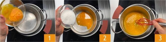 To prepare the pandoro stars with zabaione cream, start with the zabaione: place a saucepan with water on the stove and bring it to a simmer, then insert a bowl inside for the double boiling method. Add the egg yolks 1 and sugar 2 and whisk by hand until the mixture reaches a temperature of 180°F-185°F 3.