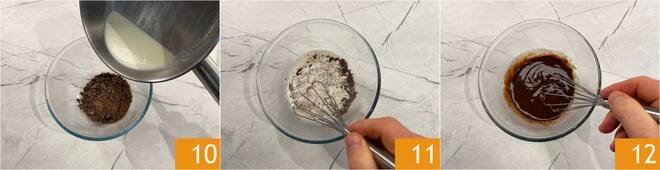 Heat the cream in a small saucepan and once it reaches a simmer, pour it directly into the bowl with the chocolate 10. Stir gently with a spatula or whisk 11, without incorporating too much air, until the chocolate is completely melted. At this point, you'll have a smooth and creamy ganache, set aside 12.