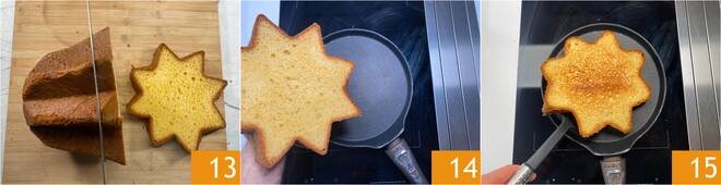 Cut the pandoro horizontally starting from the base, to obtain 3 slices totaling about 14 oz of pandoro 13. Heat a flat non-stick pan and lightly toast the pandoro stars 14 on both sides, being careful not to burn them 15.