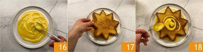 You're ready to assemble your pandoro stars: spread a couple of tablespoons of zabaione on a serving plate 16 and place the first toasted slice 17, then add another 2 tablespoons of zabaione 18 and spread it to cover all the points well.