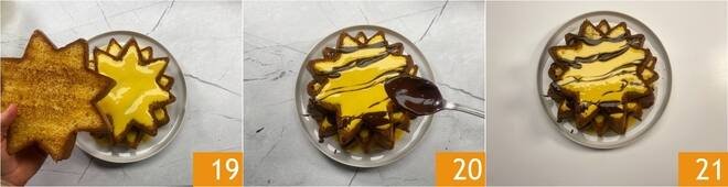 Add another slice of pandoro so that the points are staggered. Fill with a bit more zabaione and finish with the last slice of pandoro 19. Pour the remaining zabaione and spread it over the entire slice. Decorate the surface by dripping the ganache with a spoon 20. The pandoro stars with zabaione cream are ready; all that's left to do is serve them 21!