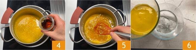 Add the Marsala wine 4 and continue stirring 5. Once the mixture is light and frothy, move the bowl into a larger bowl filled with ice and water 6; this will stop the cooking and prevent it from becoming scrambled.