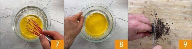 Continue to whisk for about a minute 7, then transfer your zabaione into a bowl and set aside (room temperature is fine). Proceed to make the chocolate ganache: finely chop the dark chocolate 9 and place it in a bowl.